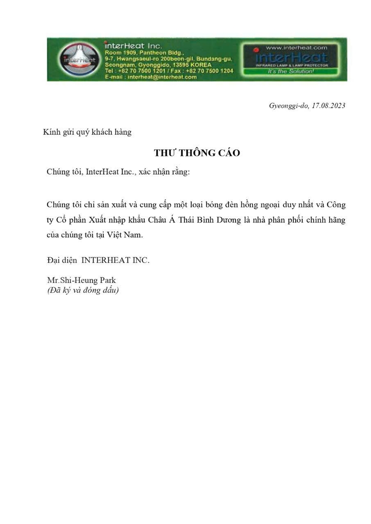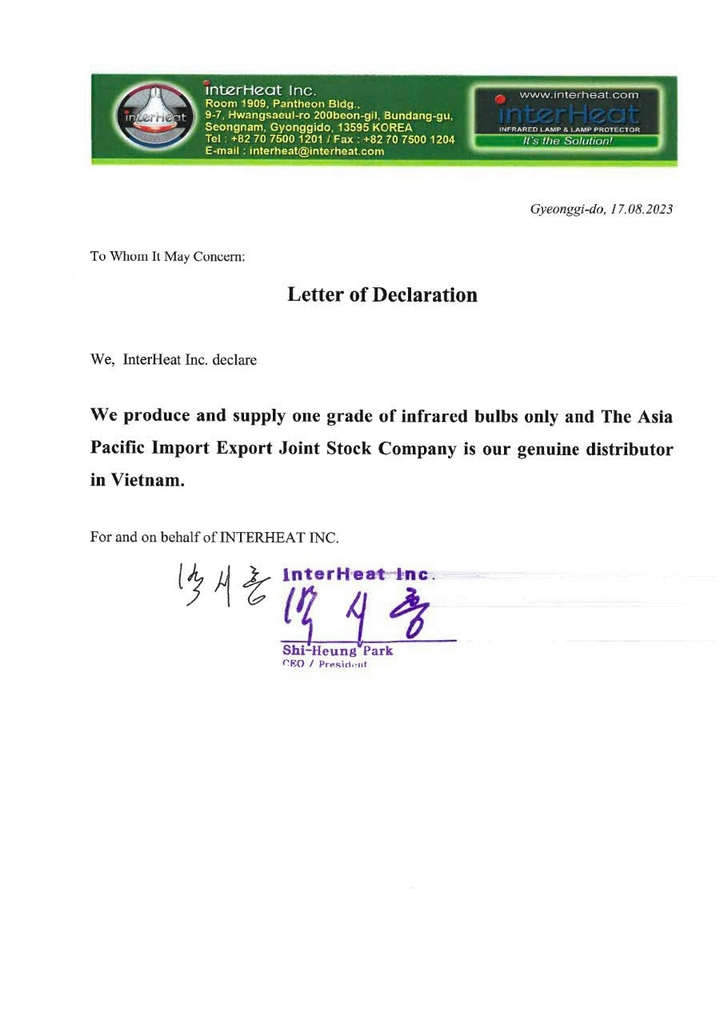 Công ty Interheat gửi bản công bố tới tất cả các khách hàng khẳng định hãng Interheat chỉ sản xuất và cung cấp 01 loại bóng đèn hồng ngoại duy nhất với thương hiệu Interheat và Đại diện nhà phân phối hàng chính hãng của Interheat tại Việt Nam là Công ty CP XNK Châu á - Thái Bình Dương.