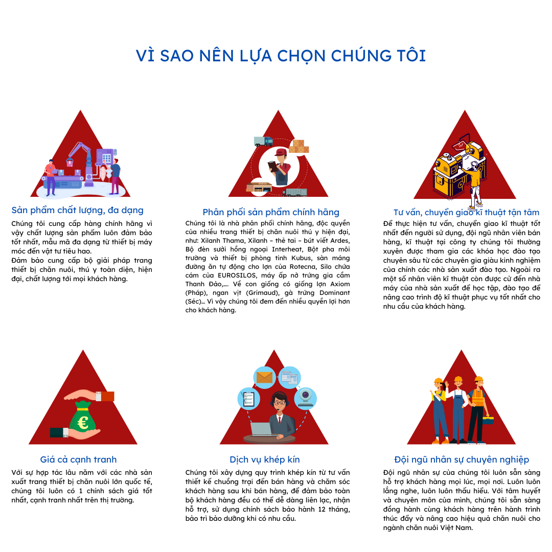 Chúng tôi đặc biệt chú ý đến việc bảo đảm chất lượng của sản phẩm hàng hóa và dịch vụ sau bán hàng. Chúng tôi tin rằng cần phải cung cấp sản phẩm hàng hóa có chất lượng cao và giá cả cạnh tranh cho khách hàng, đó là cách tốt nhất để mang lại sự hài lòng của quý khách và hiệu quả kinh doanh của công ty chúng tôi. Trách nhiệm đầu tiên của chúng tôi là tư vấn đáp ứng yêu cầu của khách hàng để phù hợp với nhu cầu của từng trang trại. Chúng tôi đặt trọng tâm là bảo đảm chất lượng hàng hóa như là một yếu tố then chốt trong việc thành công!