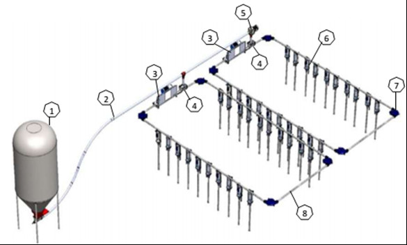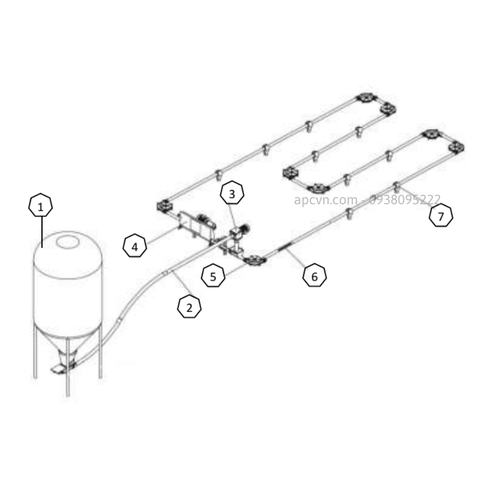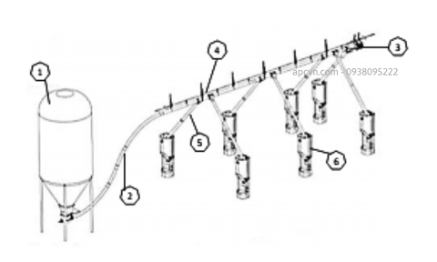 * Đường truyền vòng tròn khép kín sử dụng xích đĩa với đường cấp thức ăn bằng vít tải xoắn gồm các thiết bị: